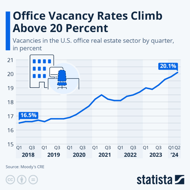 Het uitbreken van de Covid-19 pandemie had wereldwijd een grote impact. In de Verenigde Staten veroorzaakte de resulterende "pandemische schok" een snelle overgang naar werken op afstand en leidde tot een aanzienlijke daling van de bezettingsgraad van kantoren. Grote stedelijke gebieden zoals San Francisco, New York en Chicago kregen te maken met een aanzienlijke toename van de leegstand.