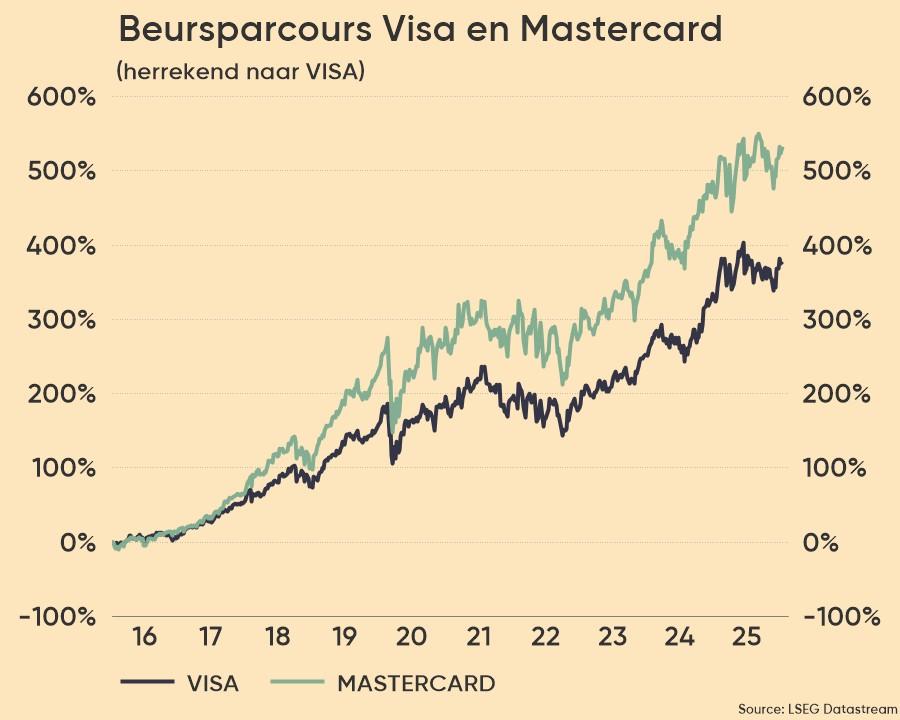 Beide spelers zijn vandaag koplopers op het gebied van agentische betalingen. Beide hebben in 2025 aparte, maar samenwerkende, kaders gelanceerd om veilige betalingen door AI-agenten te faciliteren. Potentieel versnelde groei van e-commerce is doorgaans goed voor de netwerken - meer marktaandeel en meer toegevoegde waarde (VAS). Tegenwoordig maakt de VAS-omzet, gegenereerd door identiteitsverificatie, fraudepreventie, marketinginzichten enzovoort, al 30% tot 40% uit voor beide betaalbedrijven.