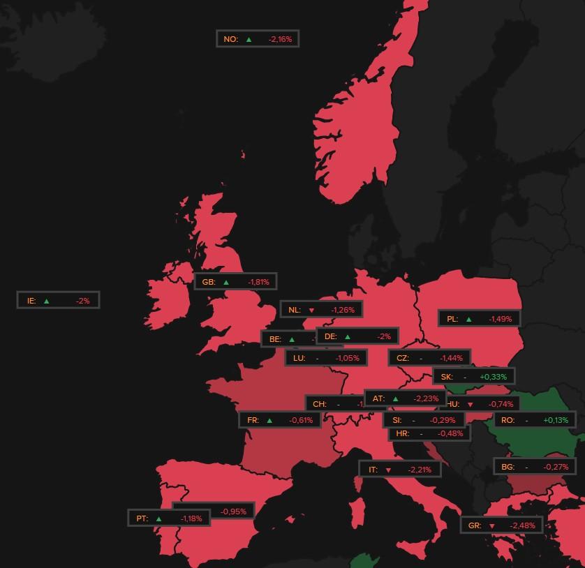 Ook in Europa verliest de banksector stevig terrein, wat eerder te wijten is aan winstnemingen na een lange winstreeks, eerder dan aan rechtstreeks besmettingsgevaar. Niettemin verliezen zowat alle Europese beurzen duidelijk terrein.