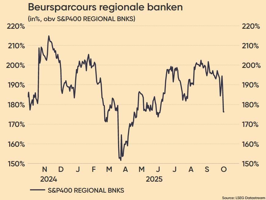Gisteren daalde de Amerikaanse regionale bankenindex, KBW Regional Banking Index, bijna 6% op één dag, terwijl de S&P 500 ongeveer 1% verloor. Dit weerspiegelt de verhoogde bezorgdheid over kredietkwaliteit en risicobeheer bij regionale banken. Aanleiding was dat Zions Bancorporation en Western Alliance negatief in het nieuws kwamen door fraudegevallen rond leningen aan fondsen die investeren in problematische commerciële hypotheken.
