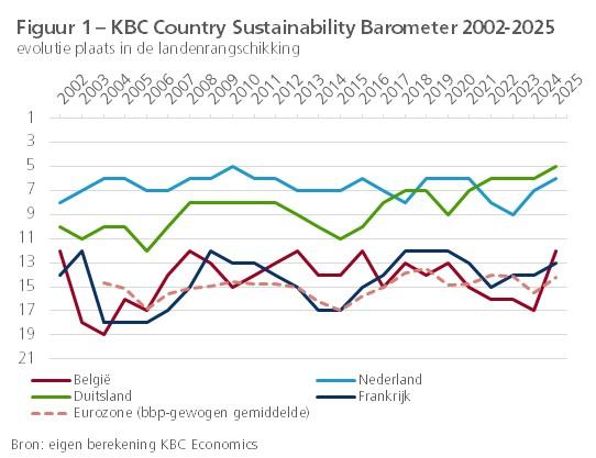 Figuur 1 toont de relatieve prestatie van België tegenover de drie buurlanden (Duitsland, Nederland en Frankrijk) en het eurozone-gemiddelde sinds de eerste becijfering van de KBC Sustainability Barometer in 2002. België presteerde over de hele periode 2002-2025 aanhoudend minder goed dan Nederland en Duitsland. De positie tegenover Frankrijk was afwisselend slechter of beter, maar tussen 2017 en 2024 lag de Belgische plaats in de rangschikking wel ook onder die van Frankrijk. Bovendien daalde België in 2022-2024 onder de bbp-gewogen gemiddelde plaats van de eurolanden. De verbetering in de jongste screening zorgde ervoor dat België klom boven zowel de Franse positie in de rangschikking als boven de gemiddelde positie van de eurolanden.