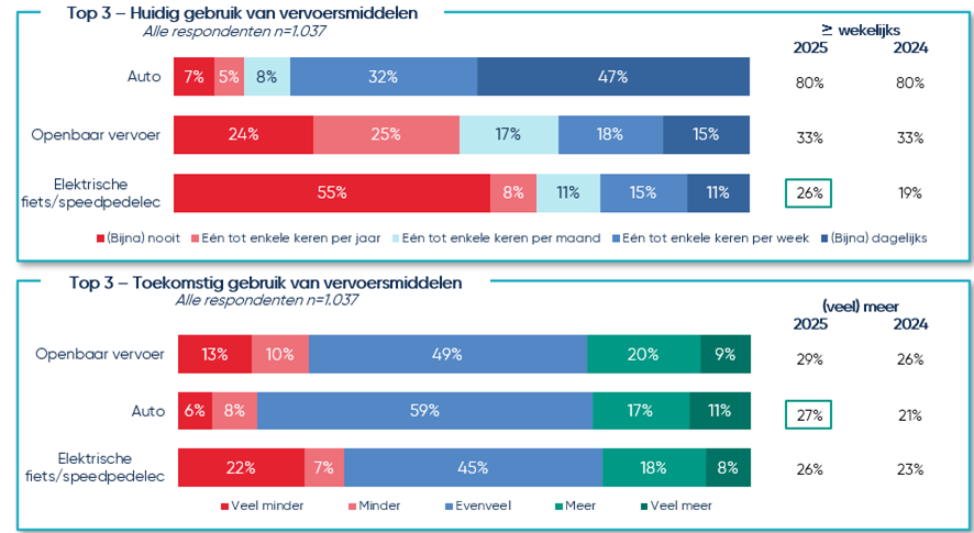 KBC peilde bij zo’n 1 000 bestuurders naar hun mobiliteitsgedrag en daaruit bleek dat bijna 80% één tot enkele keren per week de auto gebruikt. De helft daarvan zelfs dagelijks. Gevraagd naar de toekomstige vervoersmiddelen is 27% van plan om meer tot veel meer de auto te gaan gebruiken en bovendien verwacht 84% er in de toekomst zelf (nog) één te kopen.