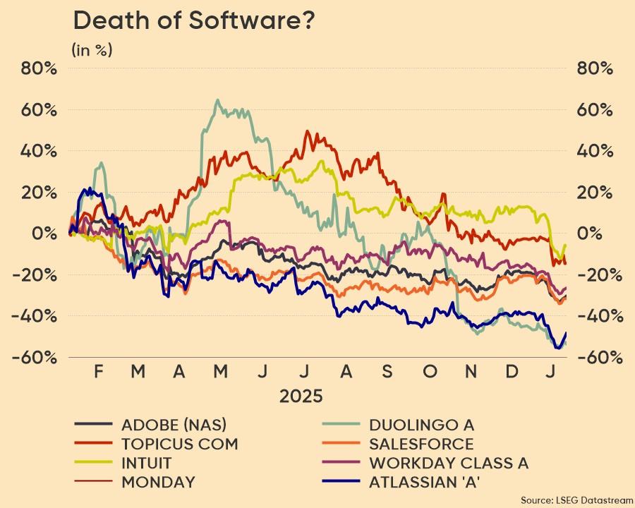 De softwaresector staat onmiskenbaar onder zware druk door de snelle opkomst van AI in het algemeen en meerbepaald Agentic AI. Die trend lijkt steeds meer taken te kunnen automatiseren, wat het traditionele SaaS‑model per gebruiker (“licentiemodel”) ondermijnt. Grote spelers zoals Adobe, Duolingo, Salesforce en ServiceNow worden geconfronteerd met het risico op tragere groei, hogere klantverloopcijfers en verminderde prijszettingsmacht. En met forse lagere waarderingen op de aandelenmarkt.