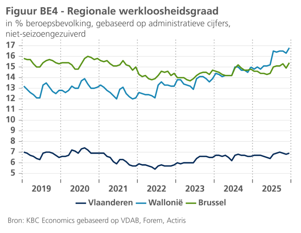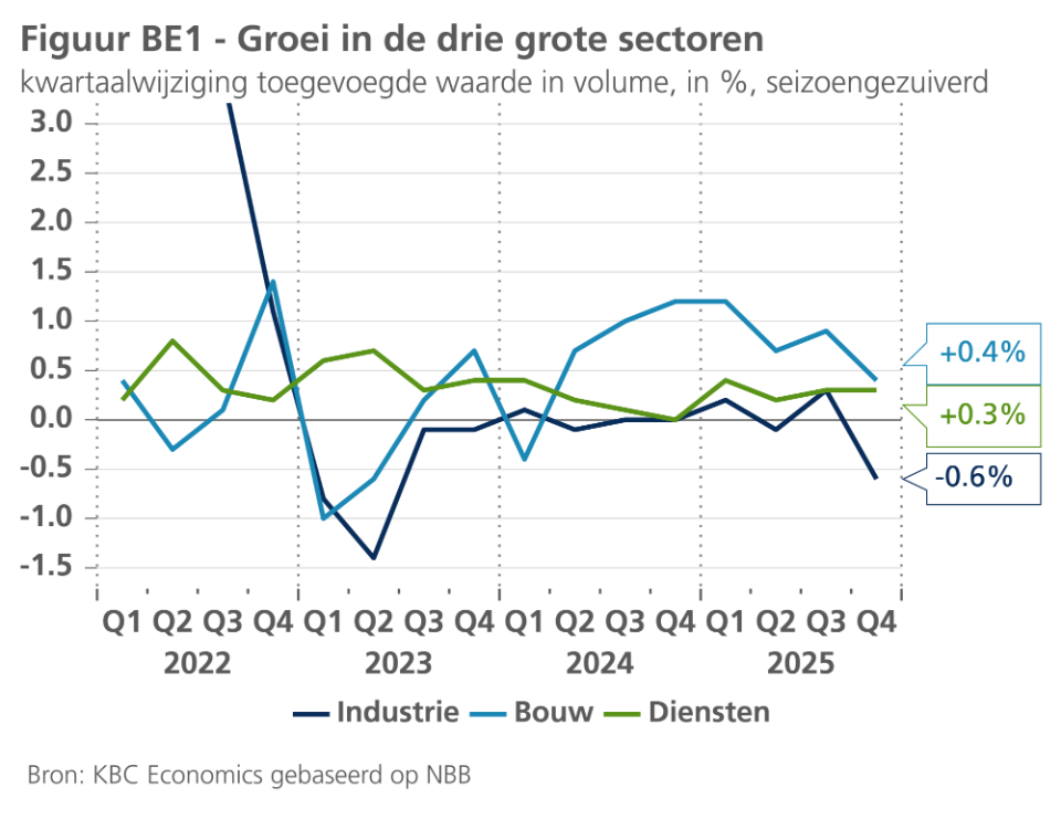 2025 was opnieuw een moeilijk jaar voor de Belgische industrie. Na in 2024 met 1,0% te zijn gekrompen, groeide de toegevoegde waarde van de sector in 2025 in reële termen met een magere 0,2%. Die van de bouw en de diensten nam met respectievelijk 3,8% en 0,9% toe. De regionale groeicijfers in België lopen achter op de publicatie van de nationale bbp-cijfers. Dit betekent dat het vooralsnog onduidelijk is in welke mate de groei in 2025 verschilde in de drie regio's. Vlaanderen heeft een relatief grotere verwerkende nijverheid en een meer open economie dan Wallonië en Brussel, waardoor het gewest allicht meer te lijden had onder de zwakke industrie en de nog altijd gespannen externe omgeving.