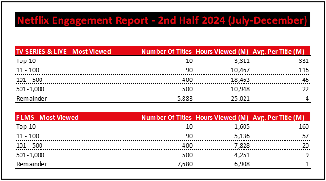 De kijktijd van Netflix volgt een vergelijkbaar patroon als dat van YouTube, waarbij de topseries en films vele malen de betrokkenheid van degenen in de lange staart oogsten. [2e foto]