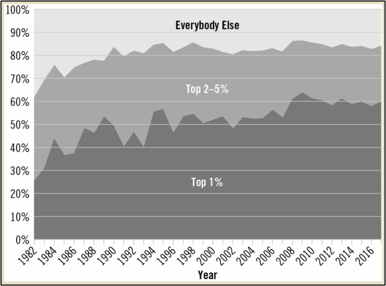 Soortgelijke conclusies kunnen worden getrokken uit de gegevens over concertgrosss . Hoewel deze gegevens slechts tot 2017 lopen, kunnen we zien hoe de top 1% van de concerten toen al samen meer inkomsten genereerde dan de onderste 99% samen. Met hoe succesvol tours van Taylor Swift, Beyonce, enz. de afgelopen jaren zijn geweest, is het veilig om aan te nemen dat de distributie vandaag de dag vergelijkbaar is.