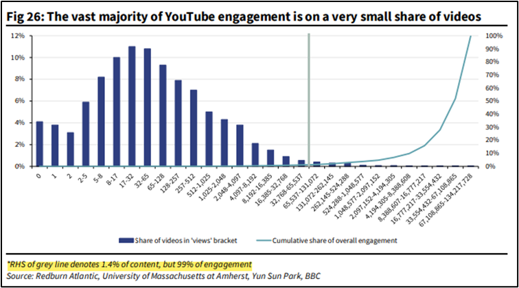 Het overgrote deel van de YouTube-betrokkenheid wordt verzameld door de top 1-2% van de video's op het platform.