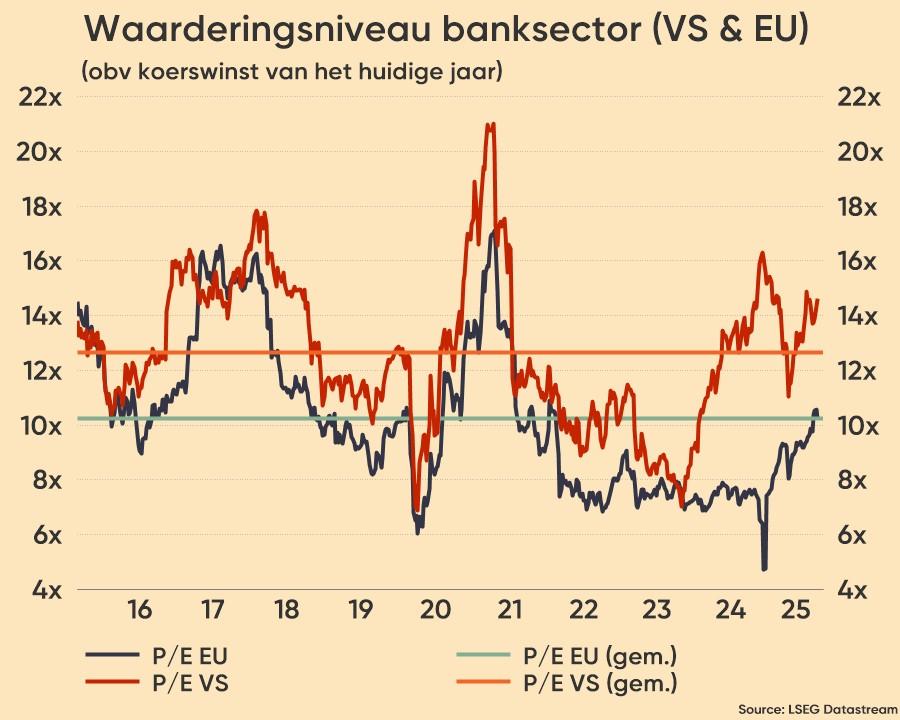 Zoals onze moedermaatschappij enkele weken geleden alweer een "beat and raise" meldde, hebben de Europese banken het tweede kwartaal afgesloten met opnieuw indrukwekkend sterke resultaten. De sector blijft een veerkrachtige winstgevendheid tonen en dat levert de trofee op van “best presterende sector in Europa” (SX7P: +10% sinds juli en +40% tot dusver in 2025). De meeste banken boekten over de hele linie betere resultaten op het gebied van nettorentebaten (NII), vergoedingen, kosten, voorzieningen en kapitaaltoereikendheid. Desondanks wordt de sector nog steeds verhandeld tegen slechts 9x 2026 winst, een korting van 30% ten opzichte van de bredere markt. Dus vragen we opnieuw: wat is de volgende stap?