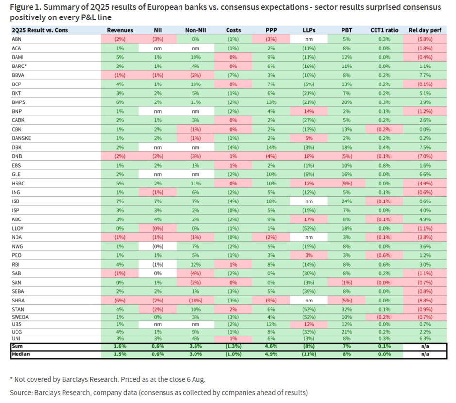 31 van de 35 grote Europese banken overtroffen de consensusverwachtingen voor de winst vóór belastingen. De betere resultaten waren te danken aan bijna elke: inkomsten, vergoedingen, kosten en voorzieningen. Hoewel de meeste banken hun verwachtingen voor 2025 handhaafden, hebben verschillende banken hun doelstellingen verhoogd. Denk daarbij aan Caixabank, Unicredit, KBC en SocGen.