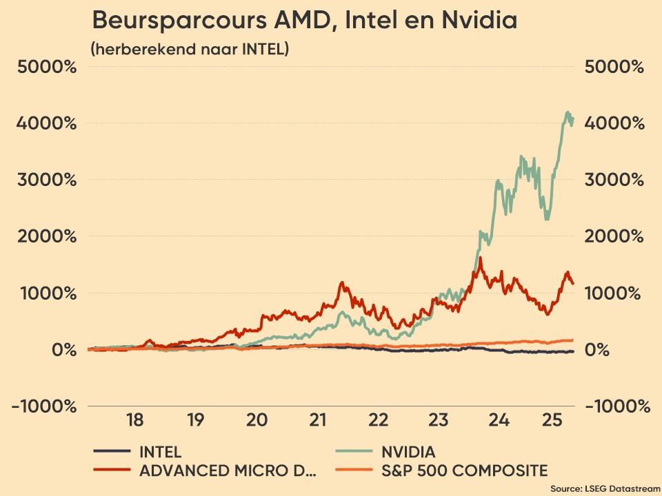 - Technologie: De Taiwanese chipproducent TSMC heeft Intel geklopt op vlak van zowel productievolumes als technologie. Concurrenten zoals AMD en Nvidia brengen nu superieure chips op de markt, geproduceerd door TSMC.
