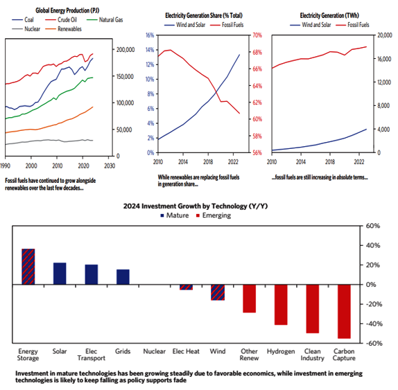Hoewel ondersteunend beleid de ontwikkeling van klimaattechnologie heeft versneld, worden investeringen fundamenteel gedreven door kostenefficiëntie, consumentenvoorkeuren en operationele bruikbaarheid. Meer dan 90% van de klimaatinvesteringen gaat naar volwassen technologieën, die waarschijnlijk zullen blijven groeien, terwijl de resterende 5-10% naar opkomende technologieën gaat die het moeilijk hebben zonder subsidies. Recente beleidsverschuivingen zullen het traject voor volwassen technologieën zoals zonne-energie niet significant veranderen, maar ze vormen wel uitdagingen voor onvolwassen technologieën zoals waterstof en koolstofafvang.