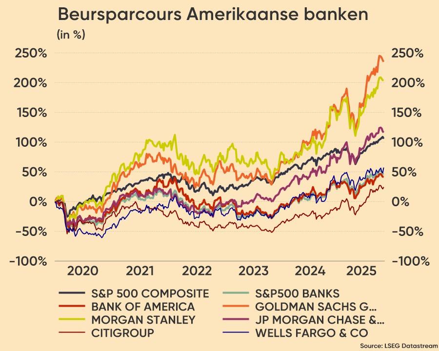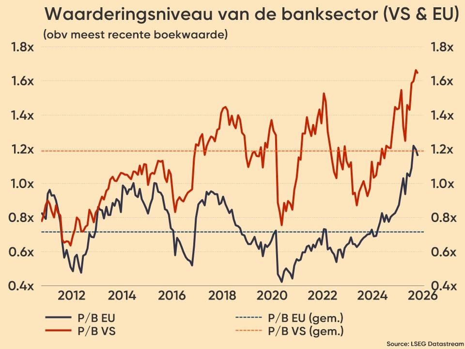 Toch is voorzichtigheid geboden. De waardering van JPMorgan is inmiddels uitzonderlijk hoog: het aandeel is dit jaar al met bijna 30% gestegen, tegenover 13% voor de bredere S&P500. Zowel de price-to-book als de price/earnings ratio bevinden zich op het hoogste niveau in vijftien jaar. Dit betekent dat veel optimisme al in de koers is verdisconteerd en dat de ruimte voor tegenvallers beperkt is.
