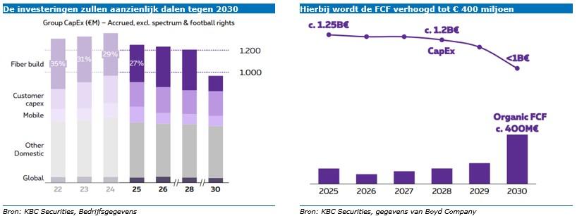 Verder beschouwen we het nieuwe dividend als een absoluut minimum en zien we ruimte voor een geleidelijke stijging van het dividend, vooral na 2028. Dit moet voortvloeien uit een daling van de investeringen in glasvezel, waarvan de uitrol tegen 2030 voltooid zal zijn en wat de vrije kasstroom tot zo’n 400 miljoen euro zal aandikken.