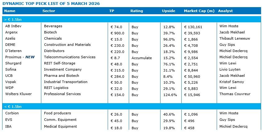 KBC Securities verving Aedifica door Proximus in zijn Top Pick Selectie. Het overgewicht aan defensievere bedrijven blijft daarmee aangehouden. De lijst omvat nu AB Inbev, Argenx, Azelis Group, Corbion, D’Ieteren Group, DEME, EVS Broadcast Equipment, Ion Beam Applications, Proximus, Shurgard Self Storage, Sofina, Vopak, WDP, Wolters Kluwer en UCB. Sinds de publicatie van de huidige Top Pick List op 4 december 2025 bedraagt het gemiddelde rendement 8,0%, tegenover 2,6% voor de Eurostoxx50. De beste performers op maandbasis zijn Vopak (+6,7%), Aedifica (+6,4% tot de schrapping op 28 feb), DEME (+4%) en WDP (+2.0%).