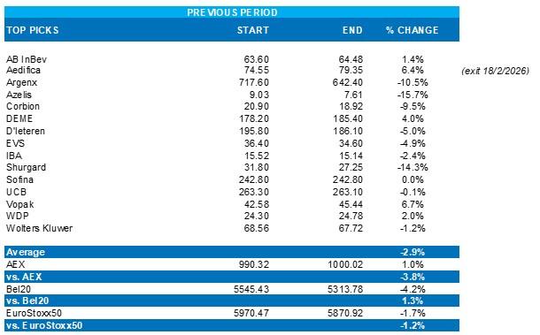 Sinds de publicatie van de KBC Securities Top Pick List op 4 december 2025 was de gemiddelde performance van de aandelen +11,2% ten opzichte van +4,0%, +10,9% en +4,3% voor respectievelijk de AEX, Bel20 en Eurostoxx50. De beste performers waren IBA (+40,3%), D'Ieteren (+35,1%), ASMi (+31,9%) en DEME (+23,2%), terwijl de slechtste performers Wolters Kluwer (-24,2%), Argenx (-10,2%) en Shurgard (0%) zijn.