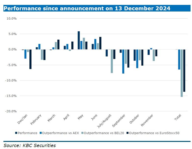 De omzet over 9M25 bedroeg meer dan € 3 miljard, nog steeds een stijging van 3% op jaarbasis, hoewel de omzet in het derde kwartaal van 2025 € 980,9 miljoen bedroeg (-9% op jaarbasis, mede als gevolg van een sterke vergelijkingsbasis). Op basis van deze resultaten over 9M25 bevestigde het management zijn verwachting dat de omzet over het boekjaar 2025 minstens in lijn zal liggen met die van het boekjaar 2024 en voorspelde het een aanzienlijke verbetering van de EBITDA op jaarbasis, met een beoogde EBITDA-marge tussen 20% en 22% (KBCSe 20,8%).