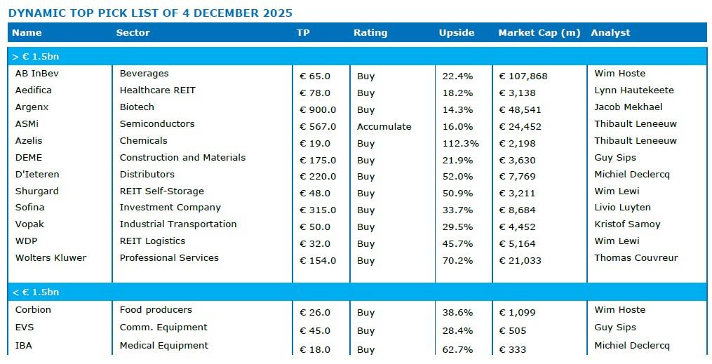 Naarmate het einde van het jaar nadert, is het stilaan tijd om het resultaat op te maken van de Top Pick selecties die einde 2024 de wereld in werden gestuurd. Ook KBC Securities maakte zonet dat rapport op én kwam aandraven met een selectie voor 2026. Niet dat vorig jaar zo’n succes werd, maar op langere termijn blijft de Top Pick Selectie, die maandelijks wordt bijgespijkerd, het met 9,2% een pak beter dan dan de BEL20 en de EuroStoxx. Op de nieuwe lijst vinden we onder meer argenx, ASMI, WDP, Sofina, Shurgard en IBA, maar dat zijn er slechts enkelen.