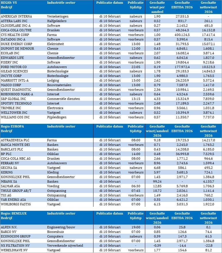 Bedrijfsresultaten zijn er vandaag in grote getale, met onder meer AstraZeneca, Banca Monte Dei Paschi, Barco, Barclays, BP, Coca‑Cola, Coca‑Cola HBC, Datadog, Duke Energy, Dupont de Nemours, Ecolab, Econocom, Edwards Lifesciences, Fiserv, Ford Motor, Fresenius, GEA Group, Gilead Sciences, Immark, InRetail, Kering, Philips, Kwarlé, Marriott, Quest Diagnostics, Robinhood Markets, Salmar, SKF, S&P Global, Spotify, Trimble, TUI, VGP Group, Welltower en Wereldhave.
