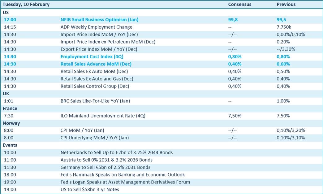 Op de economische kalender domineert de VS met een rist vertrouwensindicatoren, inflatie‑gerelateerde prijsindices, arbeidsmarktdata en een reeks detailhandelscijfers voor december. Om nog maar te zwijgen over het feit dat de schatkist nieuwe driejarige staatsobligaties gaat plaatsen. Terwijl het VK inzicht geeft in de kleinhandelsverkoop, serveert Frankrijk werkloosheidsdata en Noorwegen inflatiecijfers. Verder staan er een reeks Europese staatsobligatieveilingen op de agenda: Nederland, Oostenrijk en Duitsland brengen nieuwe schuldinstrumenten naar de markt, variërend van 2031‑ tot 2044‑looptijden.