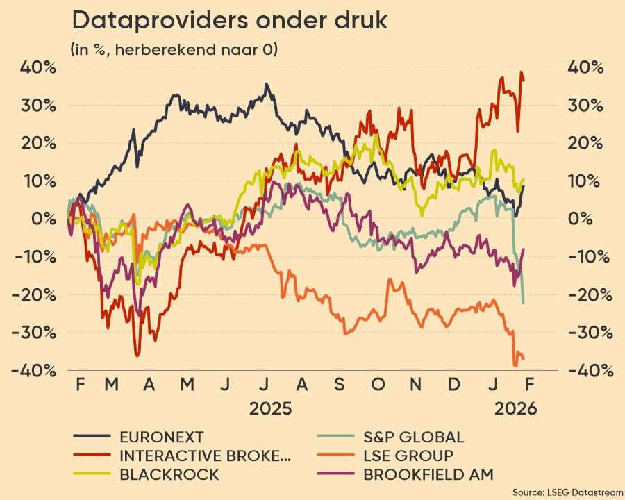 We lichten ook de sector toe van de index- en dataproviders, want ook daar stond de barometer gisteren op onweer. Aanleiding waren zwakke winstvooruitzichten van S&P Global (-10%), wat onmiddellijk druk zette op de bredere sector. Moody’s (-8,3%) werd net zoals MSCI (-3,9%) en FactSet (-3,5%) mee in het bad getrokken, terwjil Verisk Analytics slechts 1% verloor. De zwakke tijding voedt duidelijk de bezorgdheid dat de winstgroei binnen de data‑ en indexindustrie sterker zou kunnen vertragen dan eerder gedacht.