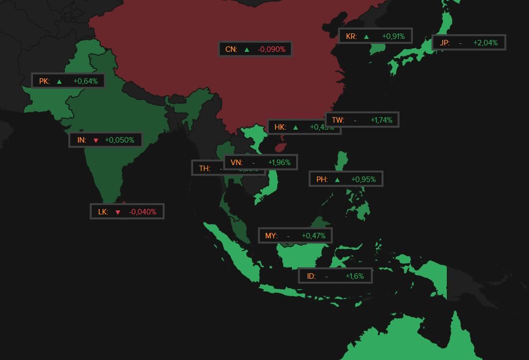 In de VS eindigden technologie-index Nasdaq–0,6% in het rood, terwijl de bredere S&P 500 0,33% zakte. Op sectorniveau zien we een vergelijkbaar beeld, maar dat werd niet zomaar doorgetrokken naar Azië. De handel vannacht verliep er overwegend positief, met slechts enkele tegenvallers. Japan hield de deuren vannacht gesloten, terwijl Taiwan (+1,7%) en Zuid-Korea (+1%) wél sterk presteerden. Die laatste klimt daarmee tot een nieuwe recordhoogte dankzij nieuwe winst voor TSMC (+2,5%), 's werelds grootste chipfabrikant. Ook kleinere landen zoals Indonesië (+1,6%) en Vietnam (+2%) deden het goed.