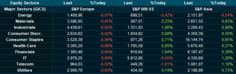 Op sectorniveau moest technologie 0,3% lager, evenveel dan de energiesector, terwijl de nutsbedrijven de rode lantaarn moesten dragen met 0,7% verlies. Dat werd aangevoerd door een daling van Naturgy (-5,4%) na verkoop van een 7,1%-belang door BlackRock, ter waarde van 1,7 miljard dollar. Industrials (+0,6%) en banken (+0,2%) stegen wel, waarbij Schneider Electric 4% aandikte dankzij een aandeleninkoopprogramma van 3,5 miljard tot 2030 én hogere margedoelen.