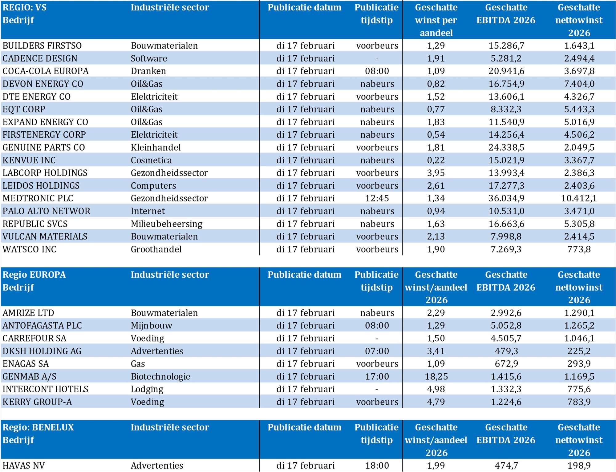 Bedrijfsresultaten komen er vandaag van onder meer Cadence Design, Carrefour, Coca‑Cola Europacific Partners, DKSH Holding, Devon Energy, Enagas, EQT, Genmab, InterContinental Hotels, Kerry Group, Kenvue, Labcorp, Leidos, Medtronic, Palo Alto Networks, Vulcan Materials en Watsco.