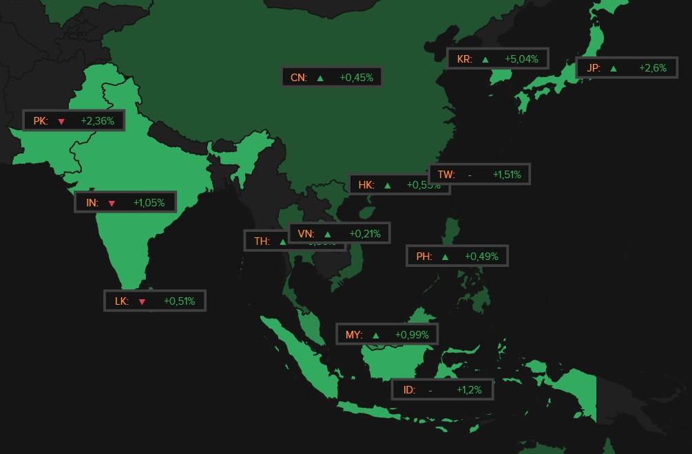 Azië hoorde het graag en noteert bijna overal de hele lijn op winst, onder meer voor Zuid‑Korea (+4,8%), Japan (+2,5%), Taiwan (+1,5%) en Hongkong (+0,6%), maar China miste de dans (‑0,2%). Centraal staat optimisme in de technologiesector, gevoed door de naweeën van een optimistisch Nvidia en sterke resultaten van chipmaker Micron Technology. Die duwden onder meer de zwaargewichten SK Hynix, Samsung en TSMC hoger.