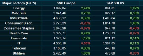 Europa klokte gisteren overwegend hoger af, met 0,6% winst voor de Euro Stoxx 600. De Duitse DAX (+0,7%), de Franse CAC40 en de BEL20 deelden in de vreugde. De meeste sectoren profiteerden, en met name energie (+2,44%), nutsbedrijven (+1,60%) en financials (+1,12%) gingen stevig hoger, maar ook grondstoffen (+0,73%), industrie (+0,39%), telecom (+0,83%) en gezondheidszorg (+0,44%) lieten zich niet onbetuigd. Consumentensectoren bleven achter, want zowel consumer discretionary (-0,26%) als consumer staples (-0,07%) boerden achteruit.