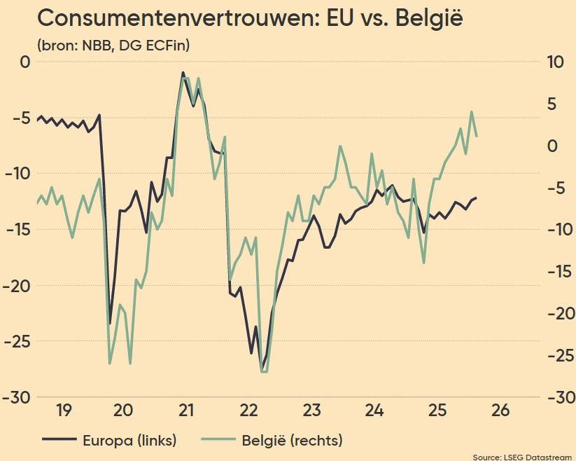 Het Belgische consumentenvertrouwen bereikte na een uitzonderlijk optimistische maand januari met 4 punten nog zijn hoogste niveau sinds 2021, maar daalde in februari opnieuw tot 1 punt. De maandelijkse enquête van de Nationale Bank bleef daarom wel ruim boven het langetermijngemiddelde, waarbij met name zorgen over de werkloosheid sterk toenamen. Dat de consument in januari nog nooit zo positief was over de arbeidsmarkt in de 40‑jarige geschiedenis van de reeks hield dus niet helemaal stand, terwijl er ook zorgen groeiden over het algemene spaarvermogen, terwijl de algemene economische situatie net positiever werd ingeschat.