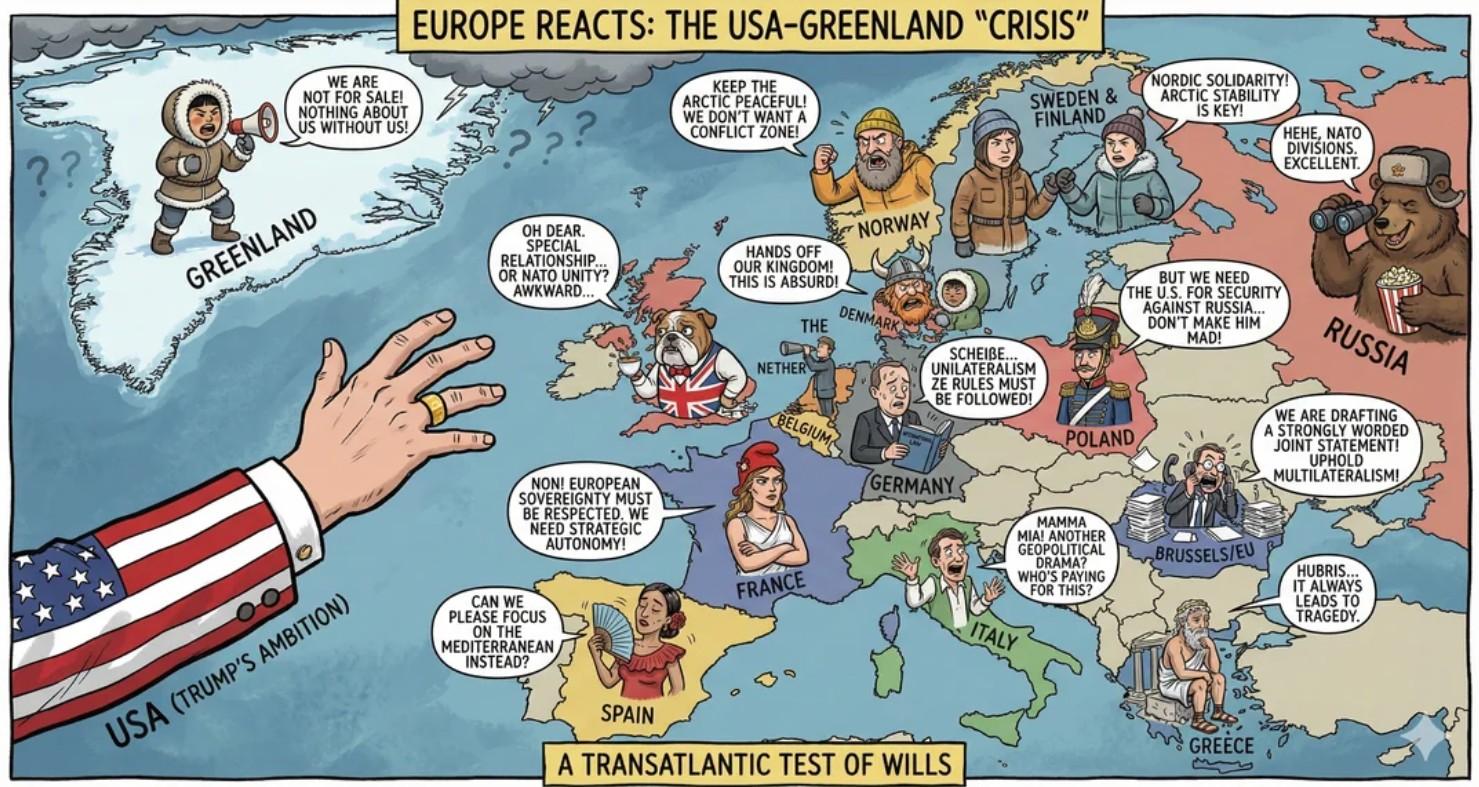 De Wereldwijde aandelenmarkten klokten met duidelijke verliezen af door hernieuwde tariefnervositeit. Een expansionistische Trump schermt met nieuwe importheffingen op goederen van acht Europese landen die zich verzetten tegen zijn geplande overname van Groenland. Politiek Europa ruilde de tot nu toe noodzakelijke vleierij voor scherpe bewoordingen, zoals “chantage”, én Frankrijk hield een pleidooi voor harde tegenmaatregelen. Denk aan importheffingen op 93 miljard euro aan Amerikaanse goederen tot het inschakelen van het Anti‑Coercion Instrument, waarmee de Amerikaanse dienstensector geraakt kan worden. Sfeer gegarandeerd op het Wereld Economisch Forum in Davos.