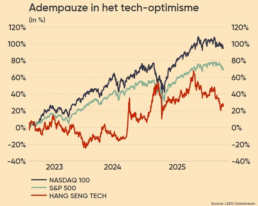 Op de valutamarkten verzwakte de euro (0,25%) tegenover de dollar (€1 = $1,1555), terwijl de yen ietwat aantrok (+0,42%, $1 = JPY 158,418). Elders ondergingen grondstoffen nogal wat deining. Zo verloor de aluminiumprijs 5,2% tot 3.242 dollar, terwijl de goudprijs dankzij dollarzwakte 1,4% herstelde tot 4.714,9 dollar en zilver zo’n 0,4% terugviel tot 72,4 dollar.