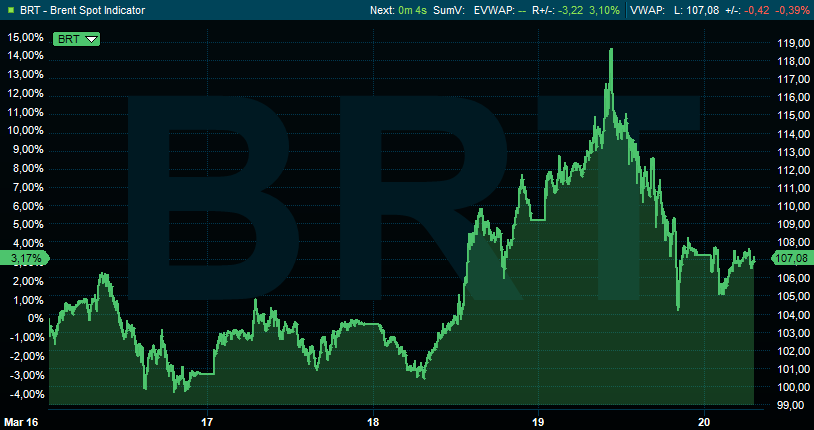 Terwijl de Europese gasprijzen initieel fors doorstegen tot €72/MWh om nadien te corrigeren naar €61/MWH, piekte de olieprijs pas in de middag op $118,36/Brent-vat, om nadien te dalen tot $106,2/vat, zelfs lager dan de slotkoers een dag eerder. Interessant. Vannacht daalde de WTI-olieprijs tot minder dan $94 per vat, na $101 aangetikt te hebben in de vorige sessie, terwijl de Brent op dit moment 107.85 dollar per vat waard is. De markt lijkt daarmee toch al niet langer (vol) te anticiperen op een verdere escalatie.