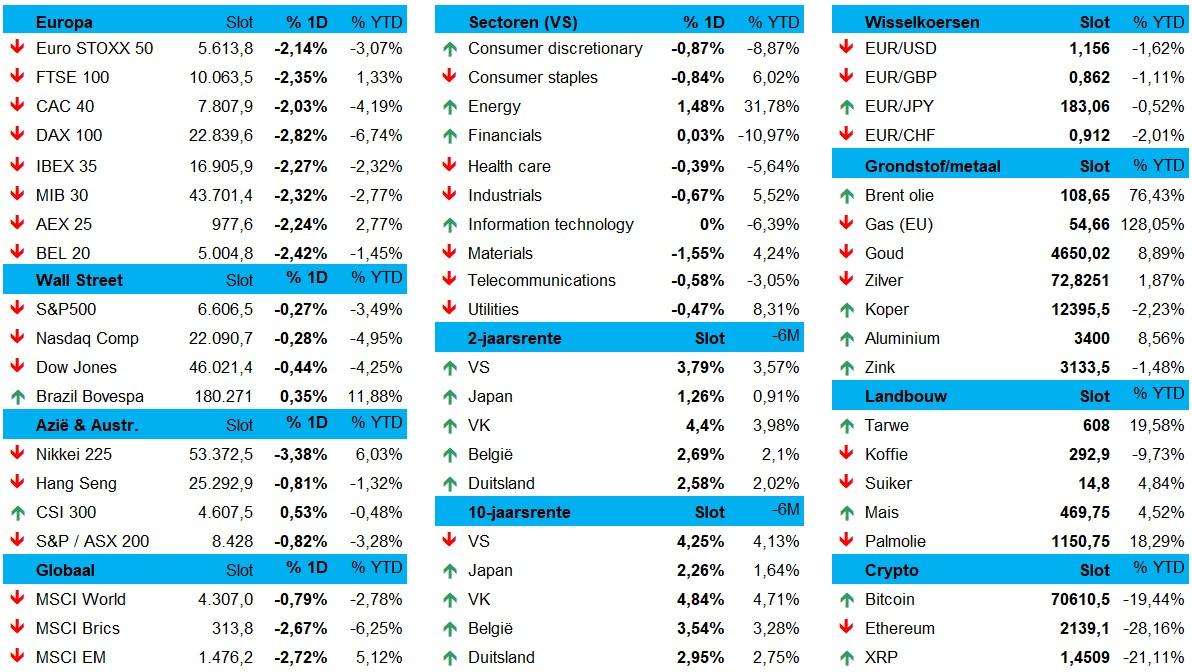 Ondertussen liep het algemene beleggers sentiment wél wat schade op. Europa heeft er in de nasleep van een off-dag op Wall Street een stevige baaldag opzitten, met brede verliezen overheen alle sectoren. Dat is doorgaans een teken dat er nogal wat handdoeken de ring in werden gegooid, waarbij vooral de structurele schade aan de Qatarese LNG-installaties als katalysator fungeerde. De Euro Stoxx 600 verloor 2,4%, de DAX 2,82% en ook de BEL20 en CAC 40 sloten negatief. Wall Street hield beter stand, weliswaar na dieprode cijfers eergisteren, met 0,3% verlies voor de S&P 500 en de Nasdaq.