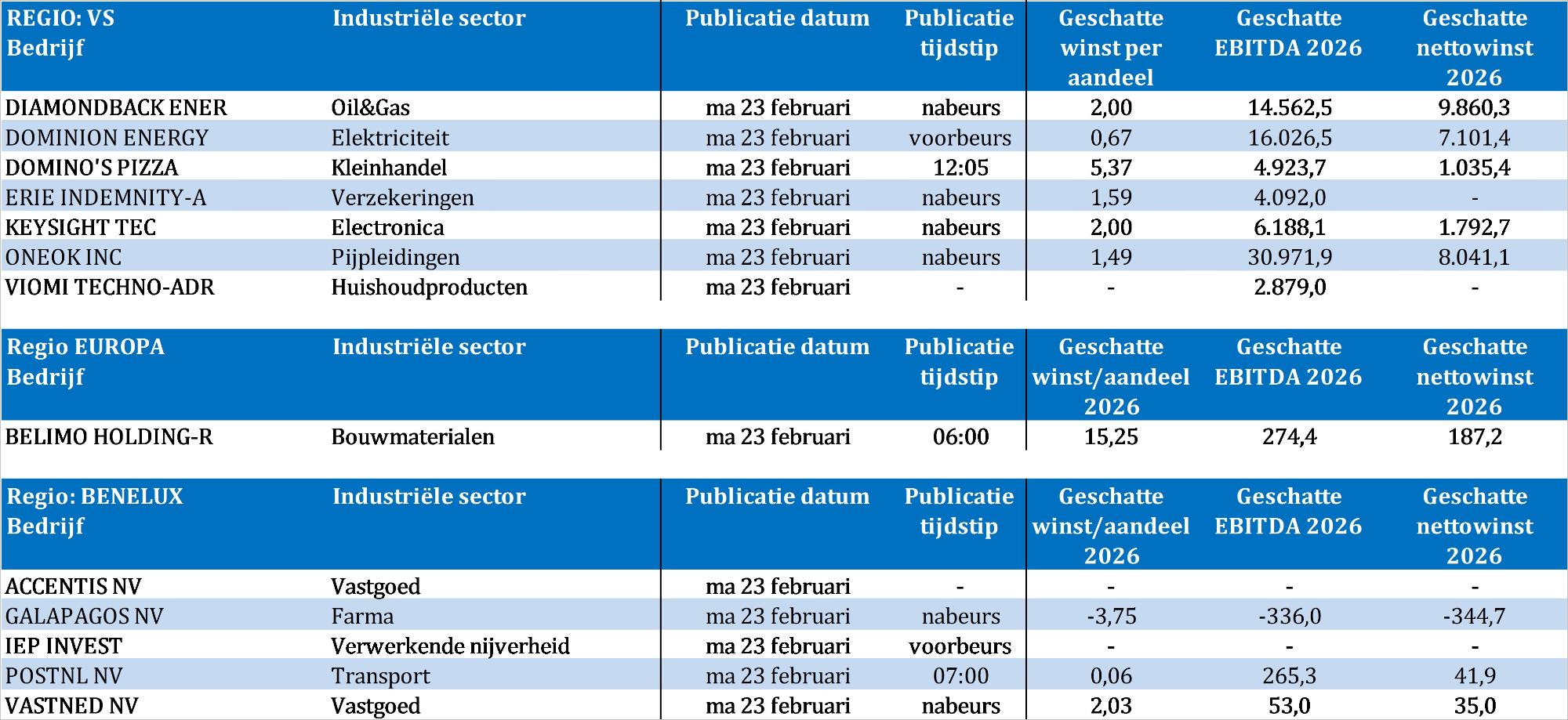 Bedrijfsresultaten komen er vandaag van Accentis, Belimo Holding, Diamondback Energy, Dominion Energy, Domino’s Pizza, Erie Indemnity, Galapagos, Iep Invest, Keysight Technologies, Oneok, PostNL, Vastned en Viomi Technology.