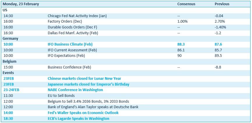 Qua economisch nieuws kijken we vooral naar Duitsland, waar een volledig IFO‑pakket voor februari wordt vrijgegeven. Inzicht in het ondernemingsklimaat, dus, geflankeerd door een inschatting van de huidige situatie en de verwachtingen. De VS zet daar onder meer het activiteitsrapport van Chicago en Dallas tegenover. België komt met ondernemersvertrouwen voor februari op de proppen, maar de speeches van onder meer Waller (Fed) en Lagarde (ECB) zijn potentieel minstens even interessant.