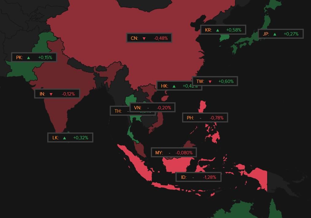 De Aziatische aandelenmarkten kenden duidelijke winnaars (Zuid‑Korea +0,58%, Taiwan +0,60%, Japan +0,27%, en Hongkong +0,42%), naast verliezers zoals (alweer) China (-0,48%), Indonesië –(-1,28%) terwijl India er geen zin in had (-0,07%).