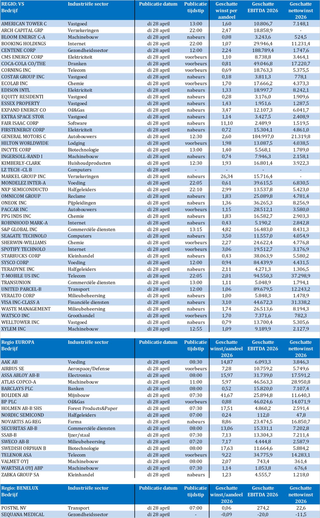 Qua bedrijfsresultaten komt er een pak op ons af. De eerste tsunami van het cijferseizoen is een feit, met onder meer Atlas Copco, Barclays, Booking, BP, Coca Cola, FirstEnergy, GM, Hilton, Mondelez, Novartis, NXP Semiconductors, Omnicom, PostNL, Robinhood Markets, S&P Global, Securitas, Spotify, Starbucks, UPS, Visa, Waste Management, Xylem etc …