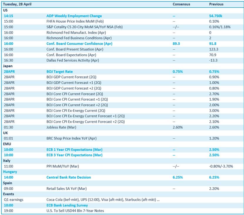 Het Amerikaanse economische nieuws omvat het consumentenvertrouwen, inzicht in de huizenmarkt en het ADP arbeidsmarktrapport. Japan voegt er een rentebesluit aan toe en een uitgebreide update van inflatie‑ en groeiverwachtingen, aangevuld met werkloosheidscijfers. In het VK kijken we naar de winkelprijzen, terwijl de eurozone nieuwe inflatieverwachtingen vrijgeeft, Italië producentenprijzen en Hongarije zowaar een rentebesluit.
