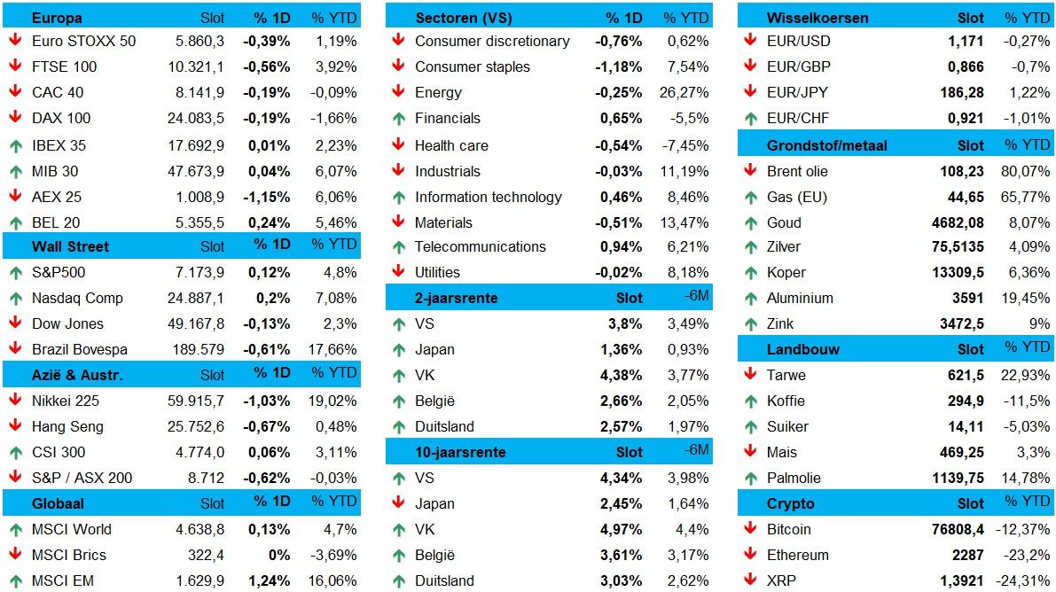 Nadat persbureau Axios gisteren al schreef dat Iran bereid zou zijn om de Straat van Hormuz te heropenen, op voorwaarde dat de VS ook een einde maakt aan de blokkade, haalde de olieprijs strategisch de schouders op. “Not impressed”, onder meer omdat de VS nog niet reageerden. De impasse in de onderhandelingen veroorzaakt nu een geleidelijke maar langdurige verdere stijging van de olieprijs, omdat de markten (eindelijk willen) begrijpen dat een 'normalisering' van de aanvoer uit de Perzische Golf (zeer) lang zal duren. De prijs voor een vat Brent steeg tot 109 dollar per vat.