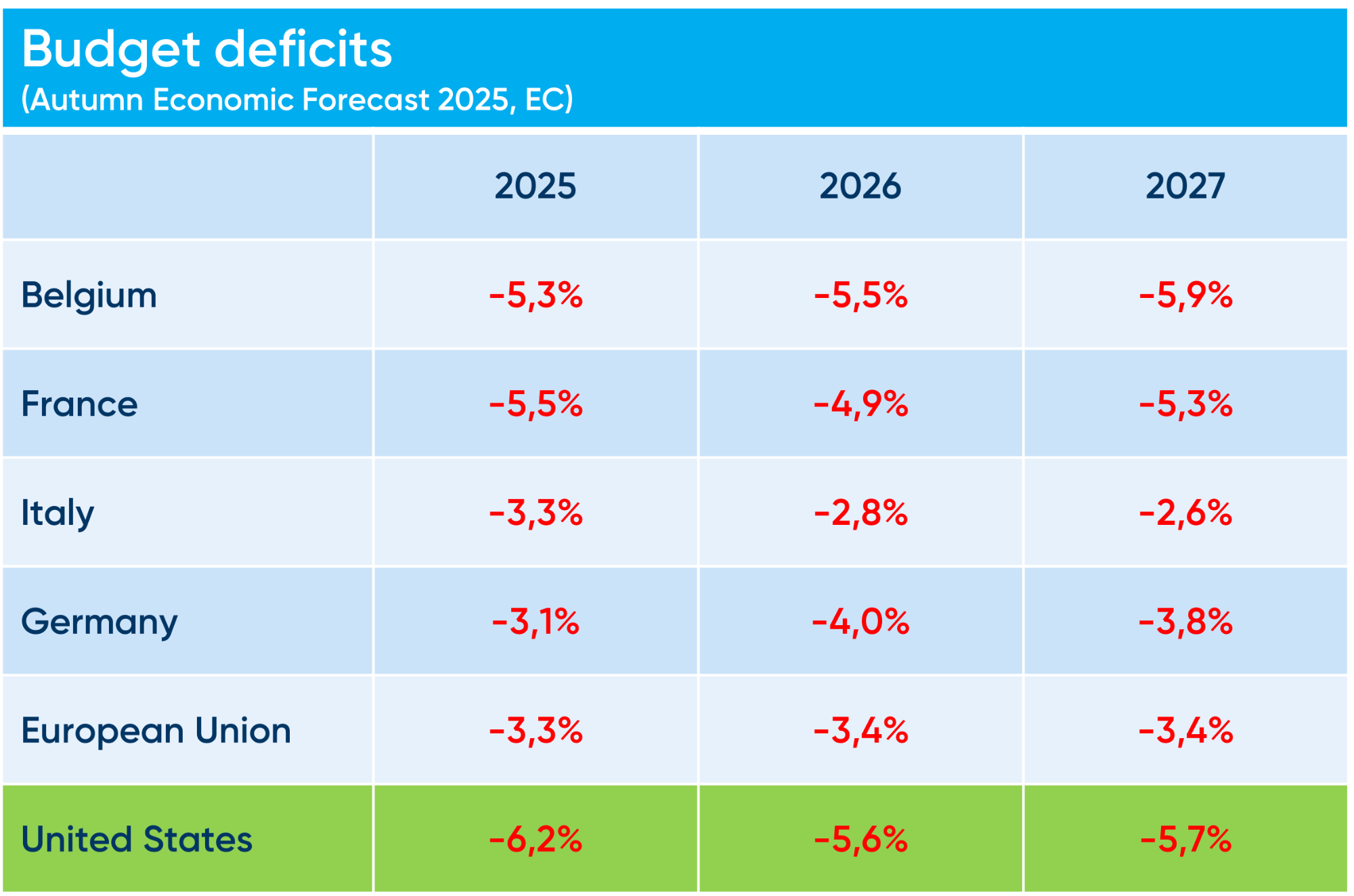 Eindigen doen we in Duitsland. Het ministerie van Financiën houdt de deur open om de grondwettelijke schuldrem op te schorten, ondanks dat plan werd afgewezen door kanselier Merz en zijn partij. Maar het ministerie van Financiën wordt geleid door socialisten en die wijzen op de gevolgen van de oorlog in Iran op de economie. Officieel is een opschorting “momenteel niet aan de orde”, maar “anticiperend en waakzaam handelen is wel vereist”. Duitsland nam al in 2020-2022 de voet van het gaspedaal en deed dat opnieuw in 2025 om massale defensie-uitgaven mogelijk te maken. Het besluit van 2025 was een permanente constitutionele hervorming. En met een geschatte schuldgraad van 65% is er nog een pak ruimte.