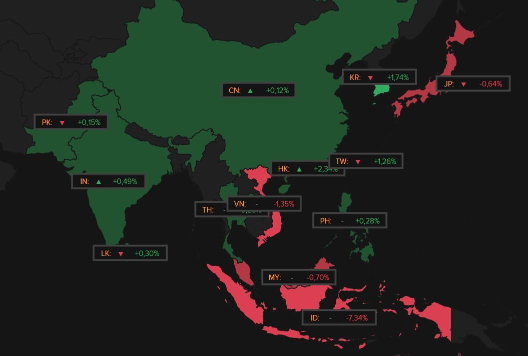 Ook in Azië gaat het zo’n beetje alle kanten uit. Duidelijke winstcijfers in Zuid-Korea (+1,74%) en Taiwan (+1,26%) verraden technologie-optimisme, net zoals in Hongkong (waar zowaar ook de vastgoedaandelen eens opveerden). En terwijl China met 0,12% winst standhield, verloor Indonesië 7,3%, Vietnam 1,35% en Maleisië (-0,7%.