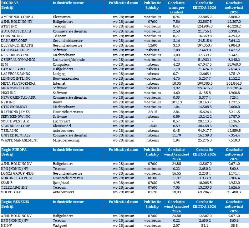 Maar we zijn vooral ook aan een eerste piek van het resultatenseizoen toe, met vandaag onder meer Amphenol, ASML, AT&T, Automatic Data Processing, Corning, Danaher, Elevance Health, GE Vernova, General Dynamics, IBM, Lam Research, Las Vegas Sands, Meta Platforms, Microsoft, MSCI, NSI, Otis Worldwide, KPN, ServiceNow, SSAB, Starbucks, Southwest Airlines, Tele2, Tesla, United Rentals, Volvo en Waste Management en meer van dat moois.