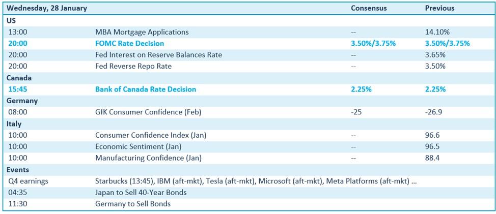 Over naar de kalenders. Ondanks de Fed de rente (nog?) niet zal verlagen, kijken we toch uit naar het rentebesluit. Dat wordt geflankeerd door een update van het aantal hypotheekaanvragen en het rentebesluit van de Bank of Canada. Dichter bij huis is het uitkijken naar het Duitse consumentenvertrouwen en de manier hoe succesvol de schatkist is in het plaatsen van obligaties (zelfde verhaal trouwens in Japan vannacht), terwijl het Italiaanse consumentenvertrouwen en de industriële vertrouwensindex eveneens op het menu staat.
