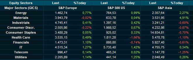 Het koersenbord is eens te meer verdeeld tussen winst en verlies. De Euro Stoxx 600 won dan wel 0,6%, maar winstnemingen in heel wat sectoren domineren even zo goed. De BEL 20 en de CAC 40 eindigden positief, maar de DAX daalde 0,15%. Enkel de grondstoffen (-0,01%) en de consumentenbedrijven (-0,2%) eindigden in de min, terwijl financials (+1,1%), nutsbedrijven (+1,1%) en technologie (+1,3%) het zeer goed deden.