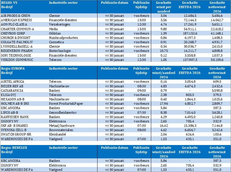 Bedrijfsresultaten komen er vandaag van Air Products and Chemicals, Airtel Africa, American Express, Aon, Beijer Ref, CaixaBank, Charter Communications, Chevron, Church & Dwight, Colgate-Palmolive, Elisa, Hexagon, Holmen, KBC Ancora, Lifco, LyondellBasell, Raiffeisen Bank, Regeneron Pharmaceuticals, Sandvik, Signify, SKF, SoFi Technologies, Stora Enso, Swatch Group, Swedbank, Sydbank, Verizon Communications, Wärtsilä en WDP.