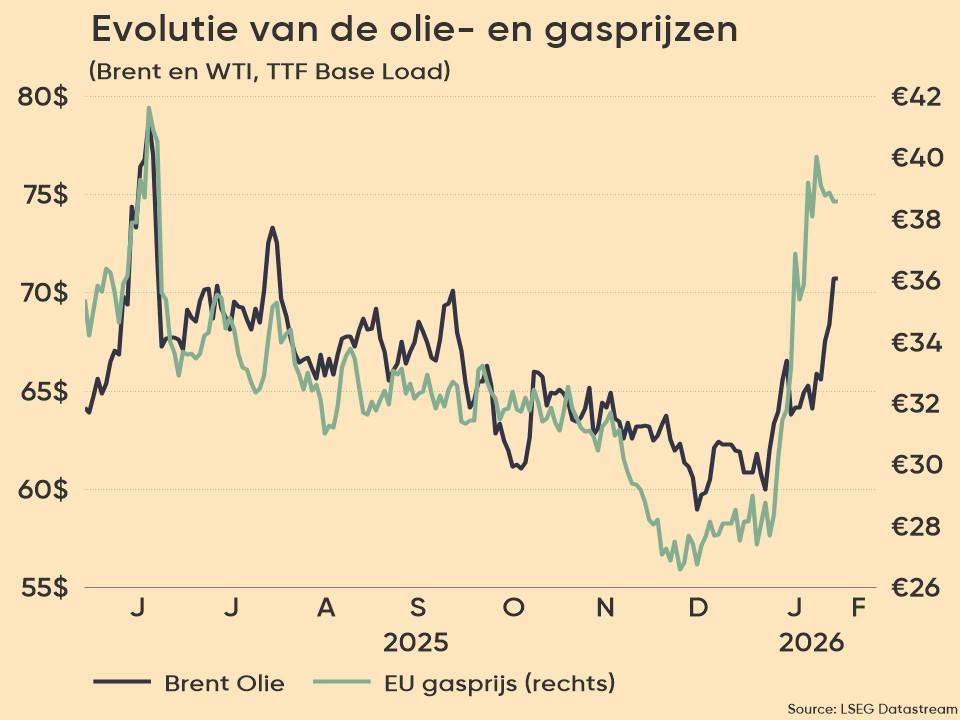 Laat op de dag schoten de olieprijzen vlot 3,5% hoger tot 70,5 dollar per Brent-vat toen bleek dat de VS een pak militair materiaal overvloog naar het Midden-Oosten om zo de reeds aangaande protesten aan te wakkeren. Dat dreigende offensief tegen Iran, de vierde grootste olieproducent binnen OPEC+ met 3,2 miljoen vaten per dag, joeg Iraanse veiligheidsdiensten en leiders onder picknicktafels en achter vuilbakken, terwijl Westerse handelaars zich alras de aloude vrees over een lockdown van de strategische Straat van Hormuz inprentten. Alleen is die Straat nog nooit eerder echt afgesloten geweest, maar goed… het is zelfs een te vermijden denkscenario, zeker nadat het gigantische Tengiz‑olieveld in Kazachstan en de Amerikaanse Winterstorm Fern al een knauw gaven aan de wereldproductie.