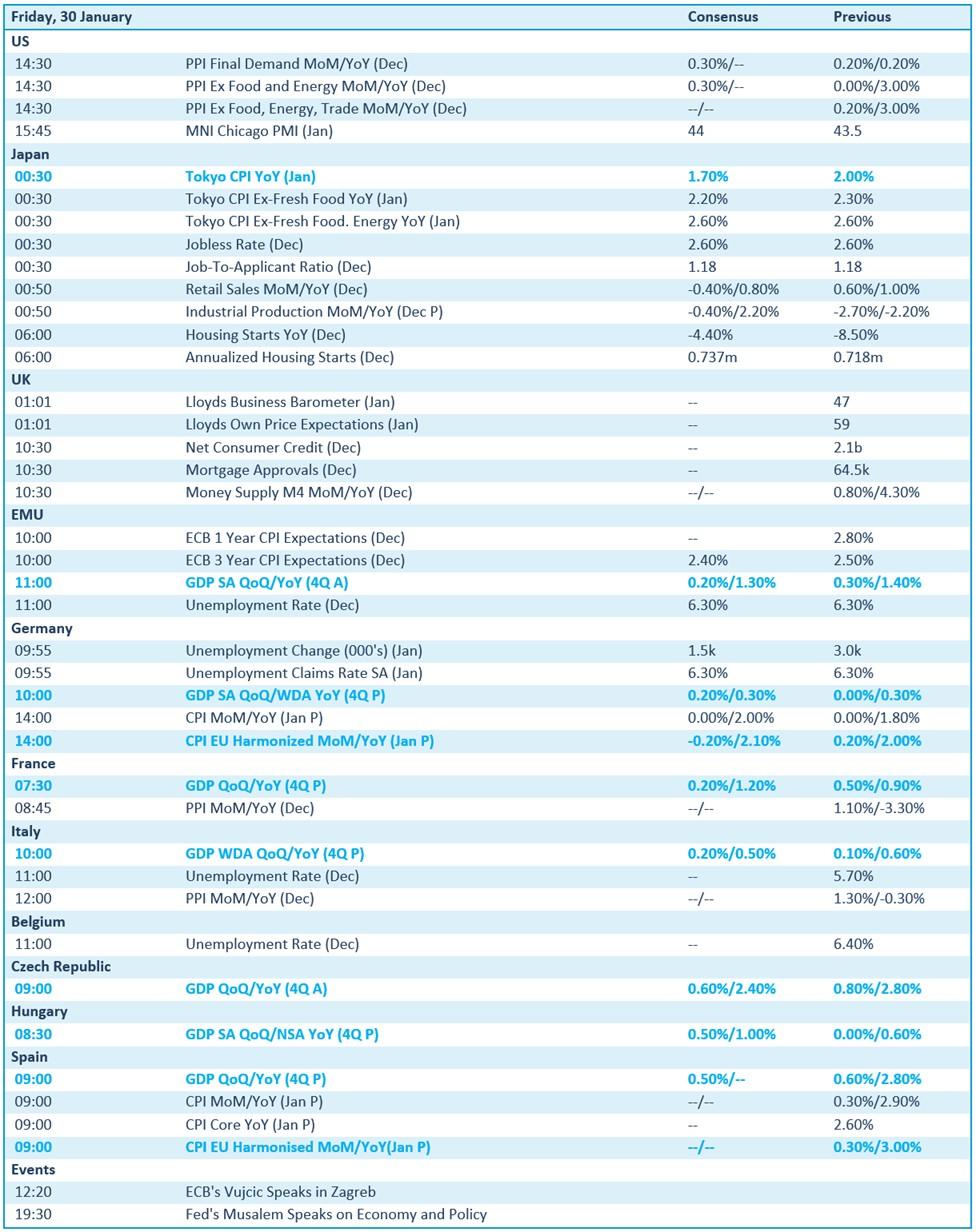 We krijgen vandaag geen economisch nieuws dat de markten in vlam kan zetten, maar cijfers zijn er natuurlijk wel weer veel. In de VS krijgen we producentenprijzen over december en de Chicago PMI-index voor januari, nadat Japan al inflatiecijfers voorschotelde. Over naar het VK, met de bedrijfsbarometer, prijsverwachtingen, consumptiedata, hypotheekaanvragen en cijfers over de geldhoeveelheid. Zowel Japan als het VK bouden dus maar beter de waarde van hun munt in de gaten vandaag. Niet zo voor de Eurozone, dat weliswaar met inflatie- en economische verwachtingen naar buiten én met het BBP in kwartaal vier. En afronden doen we in Duitsland, met data over de werkloosheid, de inflatie, de kleinhandel en het bbp.
