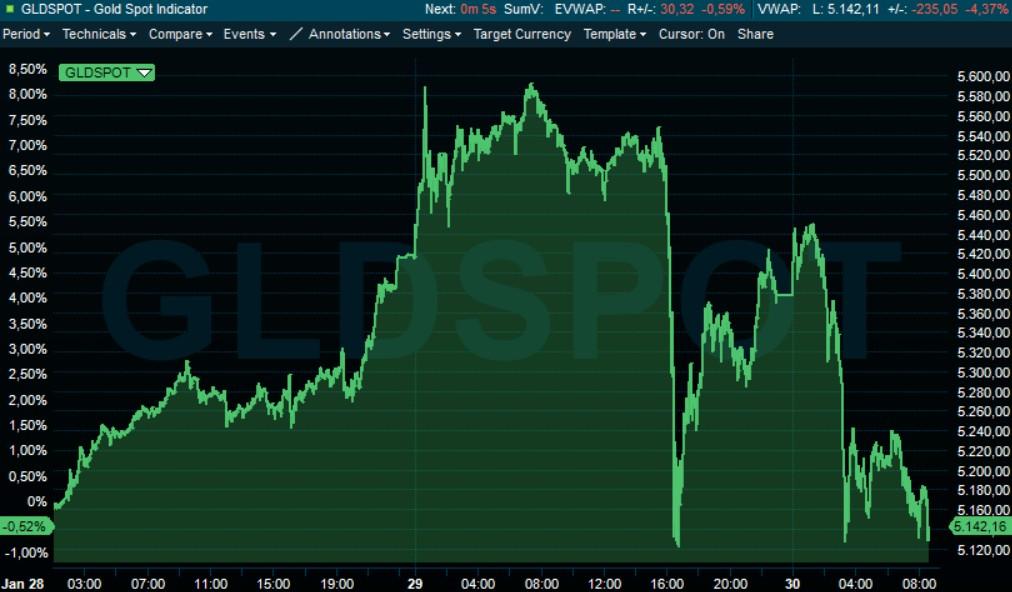 Waar begin ik met dit overzicht? Donderdag 29 januari was immers één van die dagen die héél erg deed denken aan het fantastische “Everything Everywhere All at Once” van Daniel Scheinert en Daniel Kwan. De goudprijs dartelde initieel rond 5,600 dollar per ounce, maar onderging plots de wet van de zwaartekracht tot een niveau van zo’n 5.125 dollar, om nadien op te veren tot 5,450 dollar en dan weer af te zakken tot 5.148 dollar. Zelfde verhaal voor het zilver, trouwens, waar de recente rally zonet omboog tot een nieuw verlies met 9% tot 105.37 dollar per ounce.