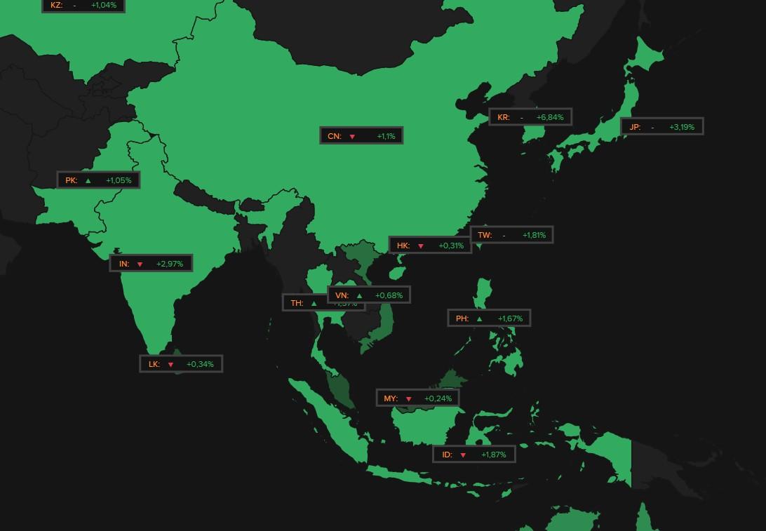 Op de aandelenmarkten koos Europa na een opening in het rood voor geleidelijk herstel. De Euro Stoxx 600 ging zelfs met 1% winst de dag uit en heeft weer zijn historisch record in zicht. De BEL20 kreeg er zelfs 1,4% bij, tegenover 0,8% voor de AEX. Wall Street ruilde de eerdere verliezen eveneens in voor 0,6% wisnt, waarmee verwaarloosbare openingsverliezen van maximaal 0,3% professioneel van de tabellen geveegd werden. En dan is er nog Azië, dat vannacht lentegroen kleurt, met Zuid-Korea (+6,8%), Japan (+3,2%), Taiwan (+1,8%) en China (+1,1%) duidelijk op winst.